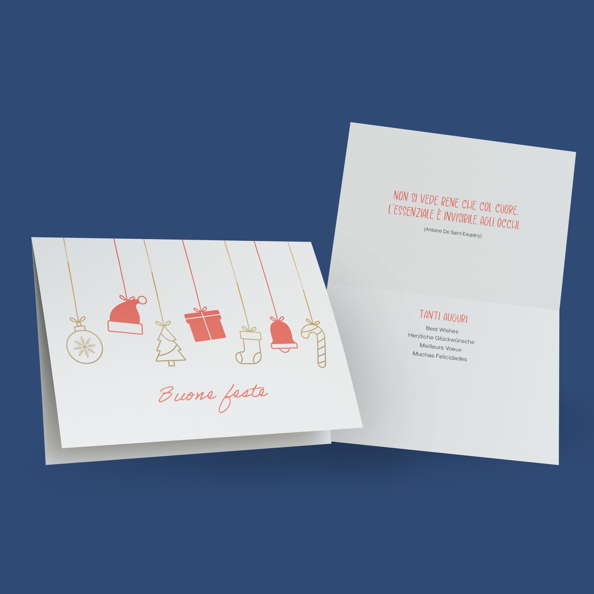 Inoltre questo biglietto di auguri è impreziosito da una stampa dorata e personalizzabile con il logo aziendale* e completo di busta.