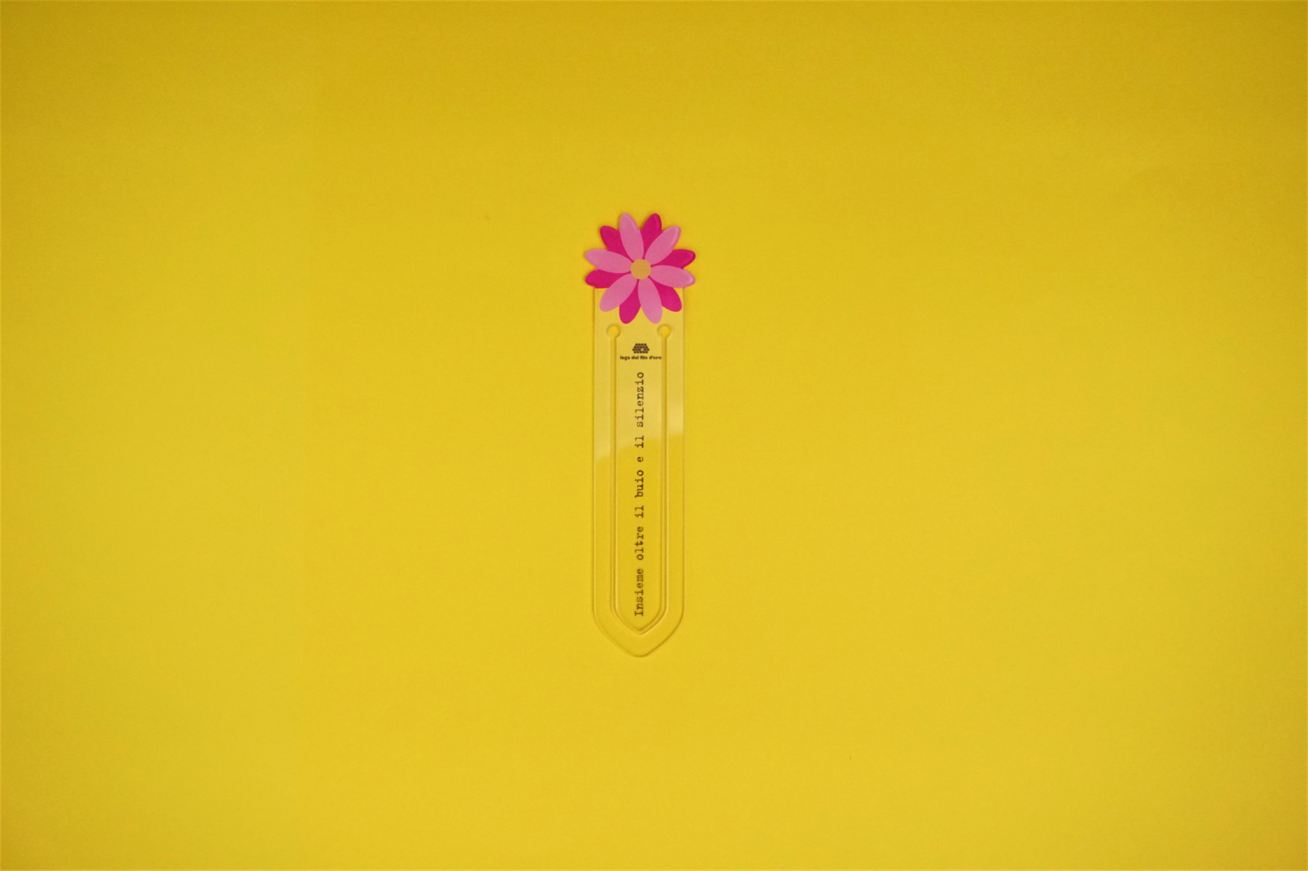 - un segnalibro in plexiglass a forma di fiore con frase "Insieme oltre il buio e il silenzio";
