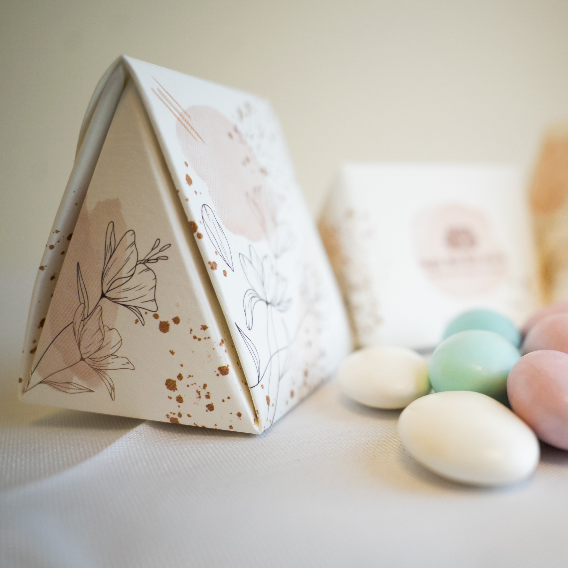 La scatolina, dall'originale forma a pochette, è realizzata in cartoncino pregiato e può contenere 5 confetti.