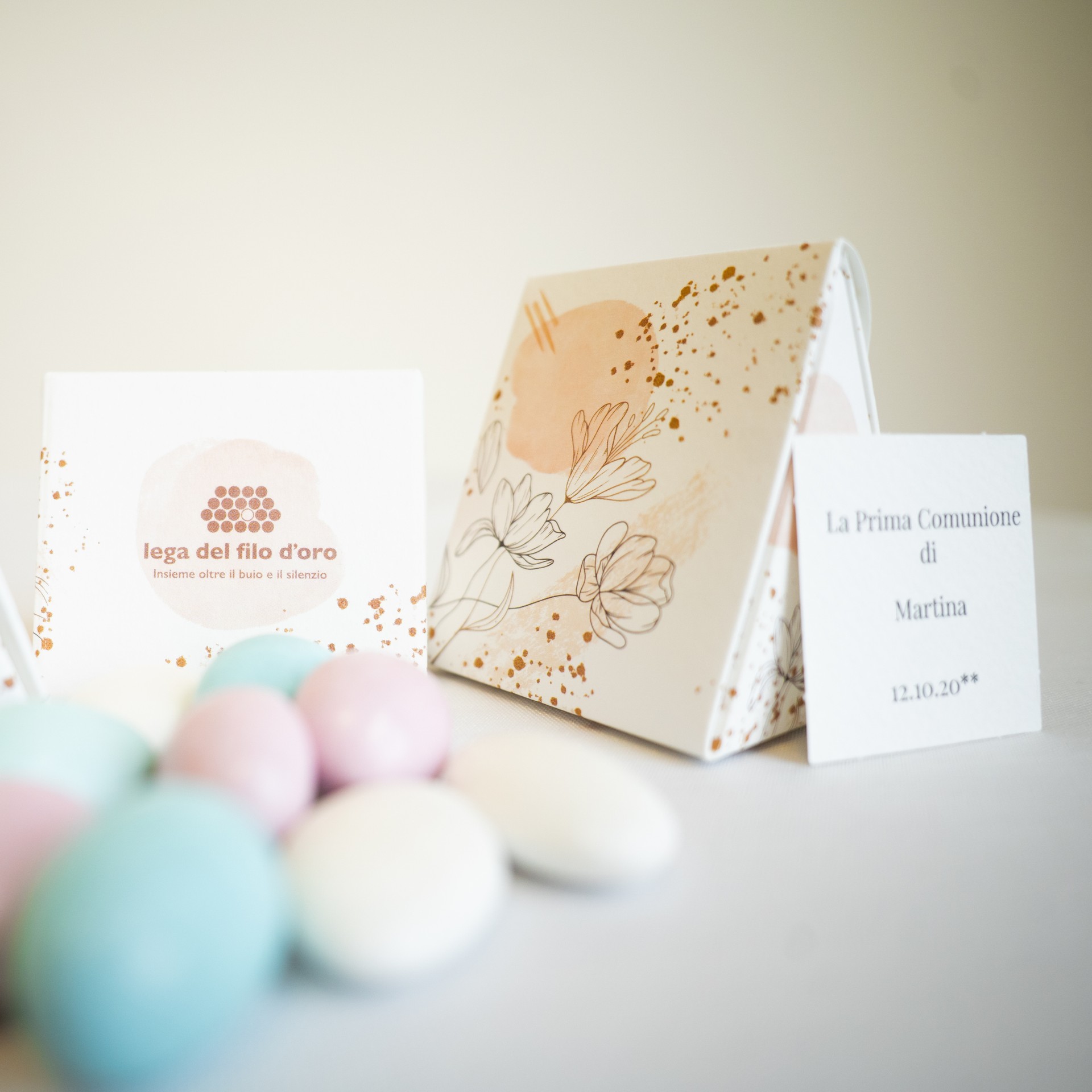 Il logo della Lega del Filo d’Oro si trova sul fondo della bomboniera.I confetti non sono inclusi.