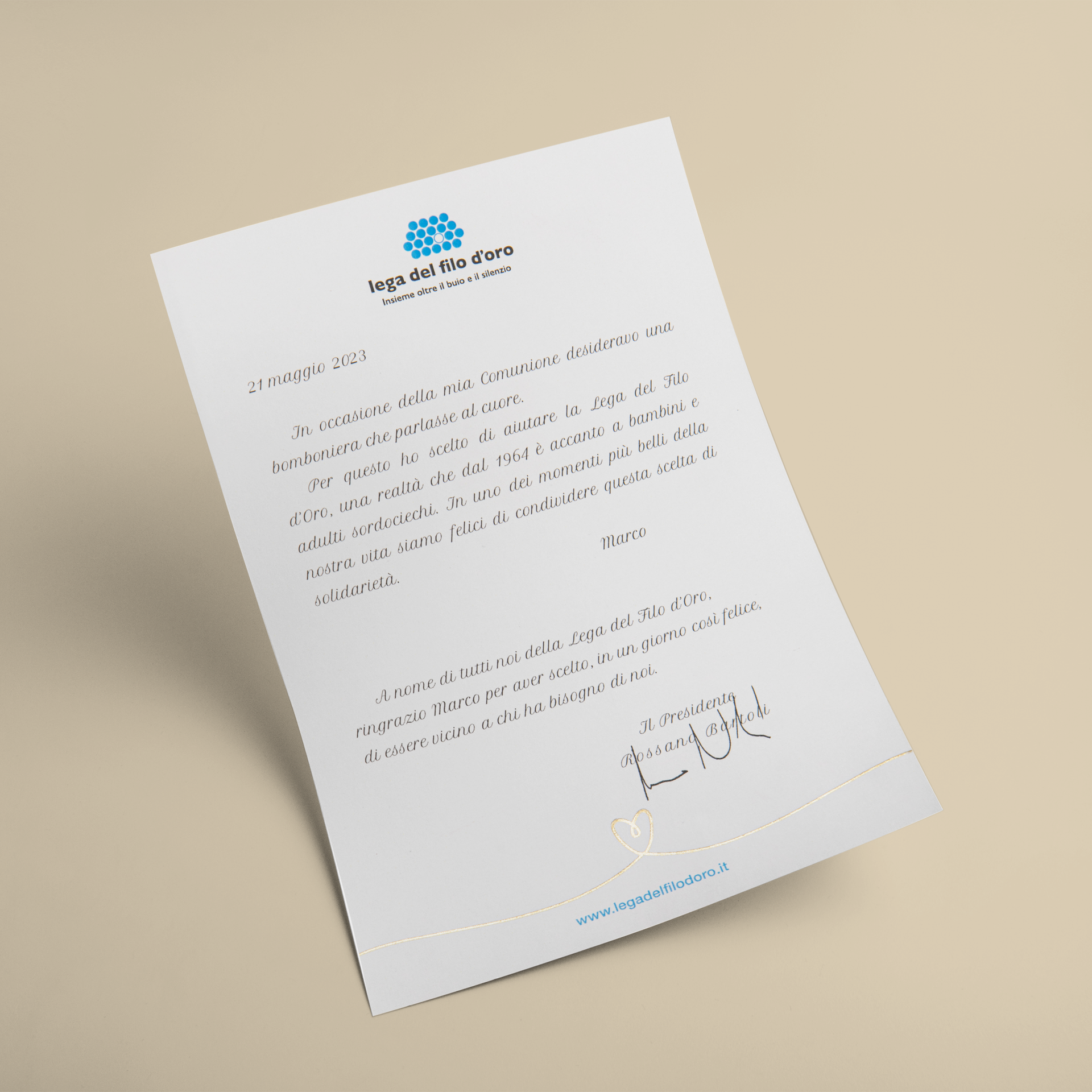 in occasione della sua Comunione, primo nominativo ha scelto di avere accanto a sé la Lega del Filo d’Oro, una realtà che dal 1964 aiuta bambini e adulti sordociechi a uscire dal buio e dal silenzio.