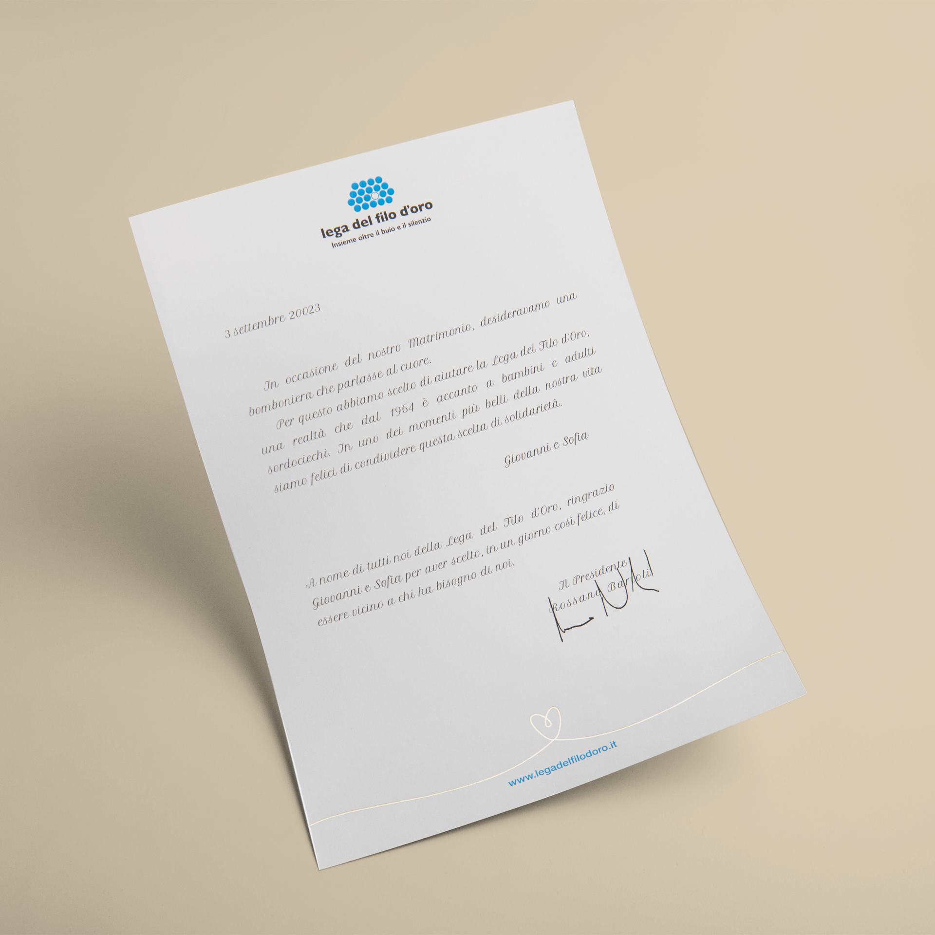 In occasione del loro n-esimo° Anniversario di Matrimonio, primo nominativo e secondo nominativo, hanno scelto di avere accanto a loro la Lega del Filo d’Oro, una realtà che dal 1964 aiuta bambini e adulti sordociechi a uscire dal buio e dal silenzio.