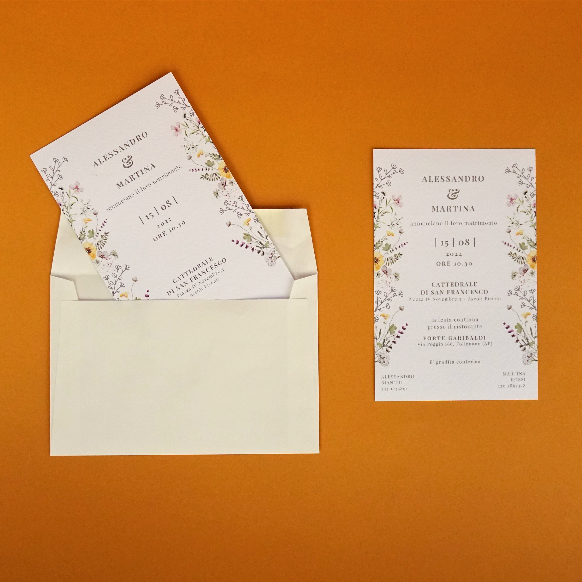 Questa elegante partecipazione di nozze a tema floreale riempirà di fiori e colori il vostro giorno speciale, rendendolo fresco e gioioso come la stampa che accompagna questo cartoncino.